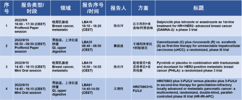 9月9日至12日(CEST),ESMO大会伊始,将有中国医学科学院肿瘤医院徐兵河院士、南京金陵医院肿瘤中心秦叔逵教授和上海交通大学医学院附属仁济医院王理伟教授报告乳腺癌、肝癌和胰腺癌的四项重磅Ⅲ期研究,分别为“达尔西利联合来曲唑或阿那曲唑治疗HR+/HER2-晚期乳腺癌的DAWNA-2研究(LBA16)”、“吡咯替尼联合曲妥珠单抗和多西他赛治疗HER2+转移性乳腺癌的PHILA研究(LBA19)“、“卡瑞利珠单抗联合阿帕替尼一线治疗不可切除肝癌的研究(LBA35)“以及“HR070803联合5-氟尿嘧啶(5-FU)和亚叶酸钙(LV)二线治疗吉西他滨难治的局晚期或转移性胰腺癌的HR-IRI-APC研究(LBA61)“,以上四项重要研究将在ESMO大会的Proffered Paper和Mini Oral环节报告,让我们一起期待这些重磅研究,第一时间领略乳腺癌、肝癌、胰腺癌领域的研究硕果。